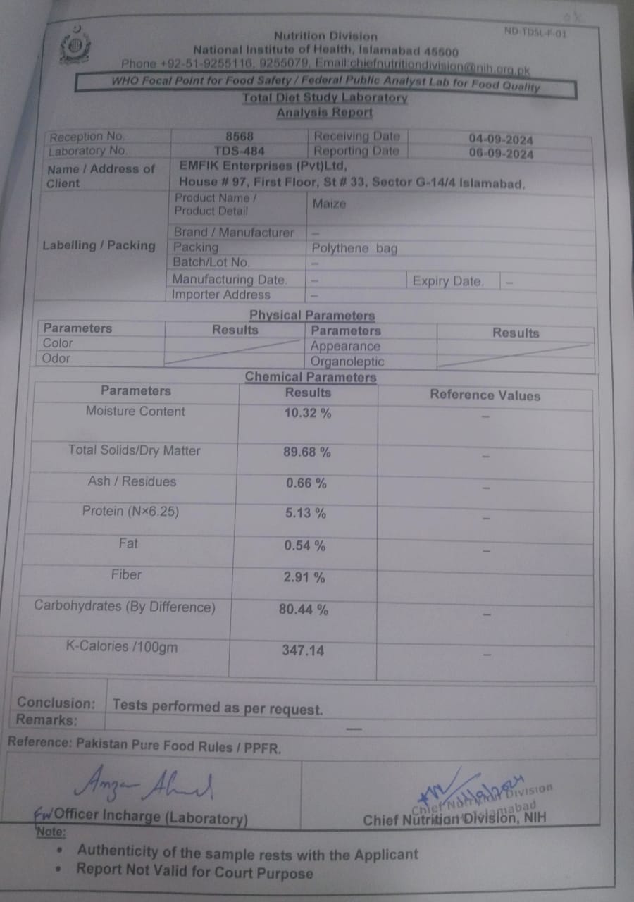 As per NIH Report: Lab tested by NIH, Islamabad (Ref #: TDS-484, Report Date: 06-09-2024)